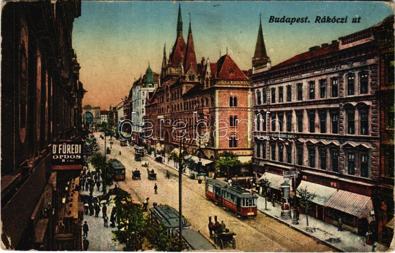 Beschreibung: 1916 Budapest VIII. Rákóczi út, Luther udvar, villamosok, Keleti pályaudvar a háttérben, Dr. Füredi orvos. Vasúti levelezőlapárusítás 1916. (EK)