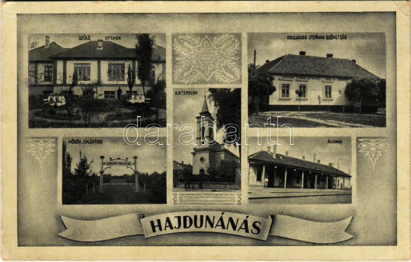 1943 Hajdúnánás, Szülő otthon, Hősök emléktere, Országos Stefánia szövetség, vasútállomás, római katolikus templom. Art Nouveau, Gál Mátyás kiadása (EK)