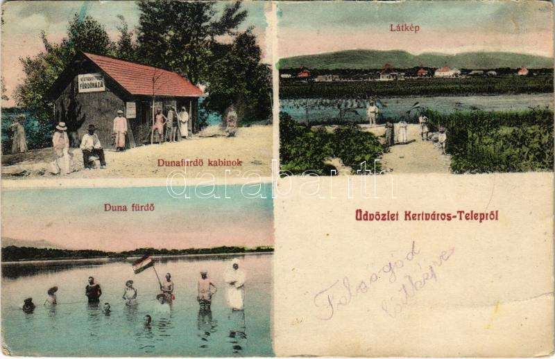 Beschreibung: Felsőgöd (Göd), Kertváros-Telep, látkép, Duna fürdő és kabinok, fürdőház, magyar zászló. Hátoldalon telek eladási reklám (Rb)