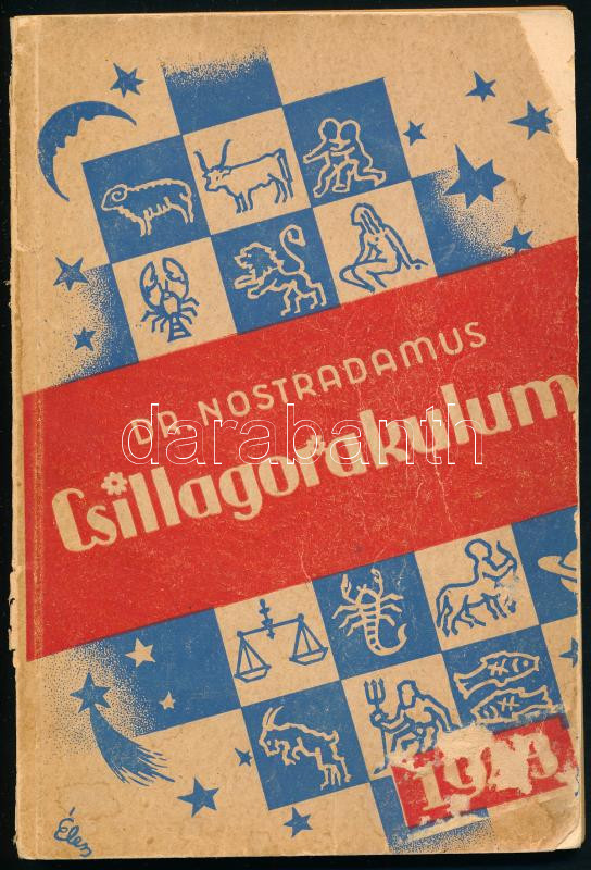 Dr. Nostradamus csillagorákuluma az 1946. esztendőre. [Bp.,]1946, Dobó. Kiadói papírkötés, szakadt, sérült, kopott borítóval, sérült gerinccel, de belül jó állapotban.