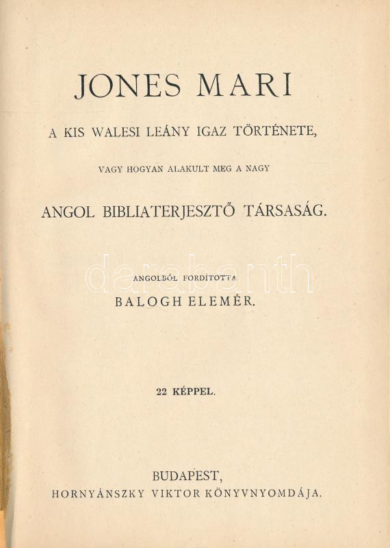 Jones Mari a kis walesi leány igaz története, vagy hogyan alakult meg a nagy angol bibliaterjesztő társaság. Ford.: Balogh Elemér. Bp., én., Hornyánszky Viktor, XI+1+116 p. Szövegközti és egészoldalas képanyaggal illusztrált. Kiadói egészvászon-kötés, jó állapotban.
