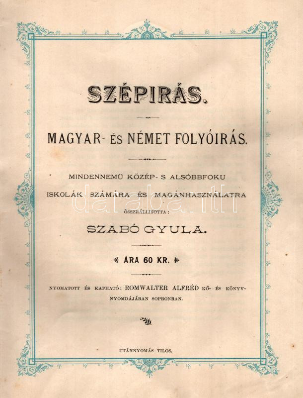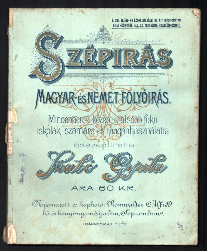 Szabó Gyula: Szépírás. Magyar és német folyóírás. H.n., Romwalter Alfr... https://www.darabanth.com/de/446-Fernauktion/446.0/Bucher/Bucher-Andere-kuriositaten~2000430/Szabo-Gyula-Szepiras-Magyar-es-nemet-folyoiras-Hn-Romwalter-Alfred-Kiadoi-papirkC3~II2937971