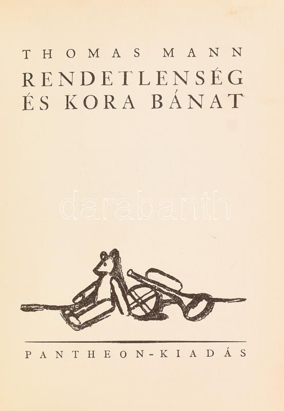 Thomas Mann: Mario és a varázsló. (Tragikus úti élmény.) Ford.: Sárközi György. Hozzákötve: Rendetlenség és kora bánat. Ford.: Dormándi László. Bp.,[1930],Pantheon,(Hornyánszky-ny.), 143+125+1 p. Lányi Imre könyvdíszeivel. Kiadói aranyozott egészbőr-kötés, Kner Erzsébet-kötés, kopott borítóval, javított, részben pótolt gerinccel, foltos lapokkal.