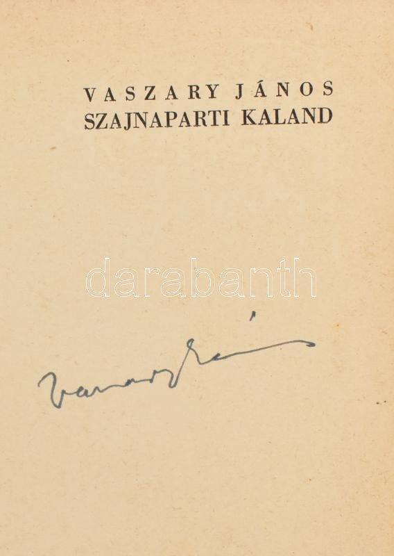 Vaszary János: Szajnaparti kaland. Regény. A szerző, Vaszary János (1899-1963) író, színész, színigazgató, rendező által ALÁÍRT példány. Bp., én., Írás. Kiadói félvászon-kötés, kopott, foltos borítóval és gerinccel, sérült kötéssel, megviselt állapotban.