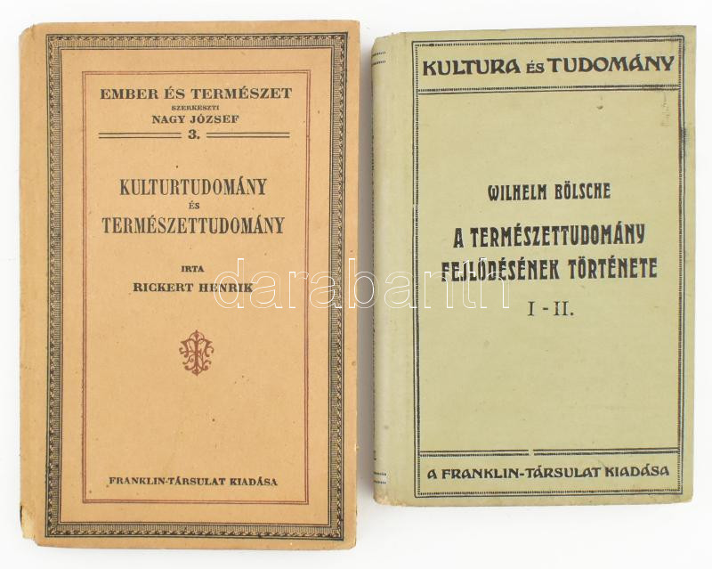 Bölsche, Wilhelm: A természettudomány fejlődésének története. I-II. köt. [Egy kötetben]. Ford.: Schöpflin Aladár. Kultura és Tudomány. Bp., 1920, Franklin-Társulat. Kiadói egészvászon-kötés, kissé foltos lapszélekkel. + Rickert Henrik: Kulturtudomány és természettudomány. Ford.: Posch Árpád. Ember és Természet 3. Bp., 1923, Franklin-Társulat. Kiadói kartonált papírkötés, a gerincen kis sérüléssel.