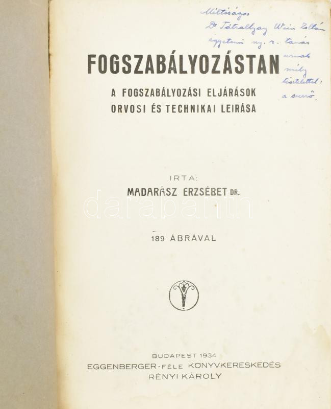 Madarász Erzsébet: Fogszabályozástan. A fogszabályozási eljárások orvosi és technikai leírása. Bp., 1934, Eggenberger. Kiadói papírkötés, borítón szakadások, néhol foltos lapok, kopottas állapotban.