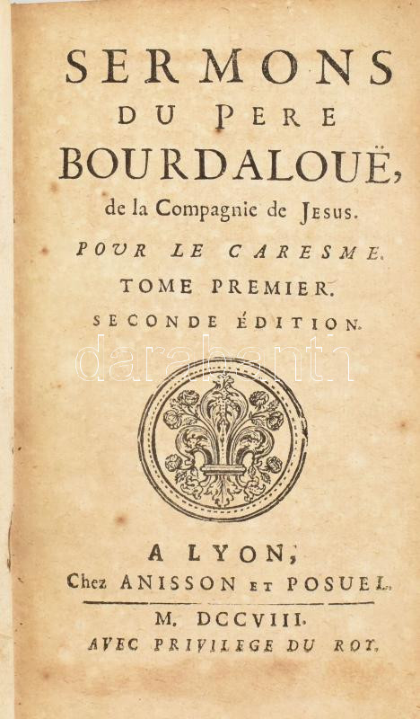Sermons du Pére Bourdaloue, de la Compagnie de Jésus. Pour le caresme. Tome Premier. Lyon, 1708., Anisson et Posuel, 4+446 p.+27 sztl. lev. Francia nyelven. Seconde édition. Korabeli aranyozott bordázott egészbőr-kötés, kopott borítóval, a borítón és a gerincen sérülésekkel, possessori bejegyzéssel.