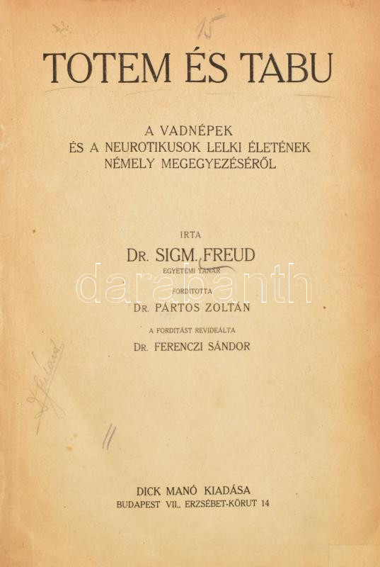 Dr. Sigmund Freud: Totem és tabu. A vadnépek és a neurotikusok lelki életének némely megegyezéséről. Ford.: Dr. Pártos Zoltán,a fordítást revidiálta Dr. Ferenczi Sándor. Bp., (1918), Dick Manó, 174+2 p. Korabeli félvászon kötésben, kopással