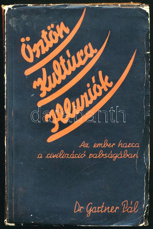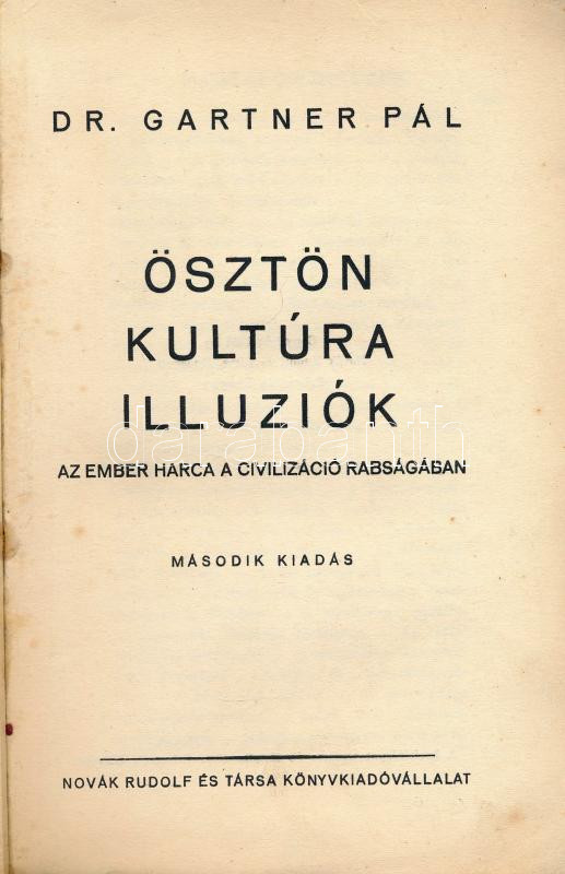 Garterner Pál: Ösztön, kultúra, illúziók. Az ember harca a civilizáció rabságában. Bp.,1934,Novák Rudolf. Második kiadás. Kiadói papírkötés, kopott, foltos borítóval, egy lap szakadással (előszó), egy lapon kis sérüléssel.