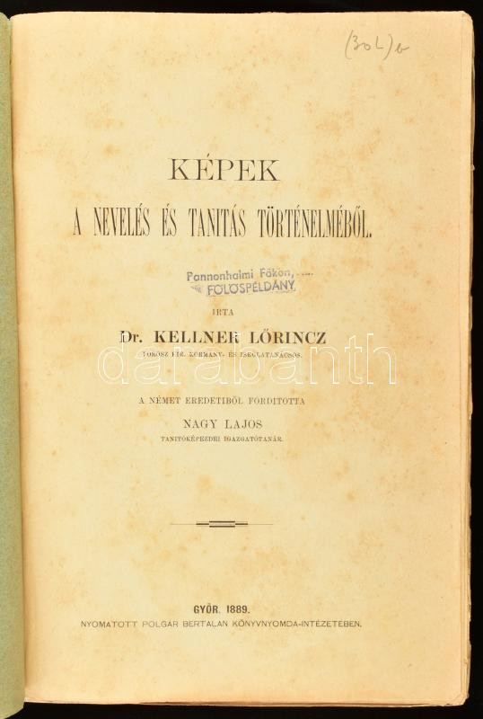 Kellner Lőrincz: Képek a nevelés és tanítás történelméből. Ford.: Nagy Lajos. Győr, 1889., Polgár Bertalan-ny., 477+2 p. Kiadói papírkötés, kissé szakadt borítóval, régi intézményi bélyegzéssel.