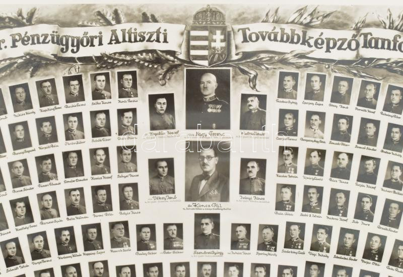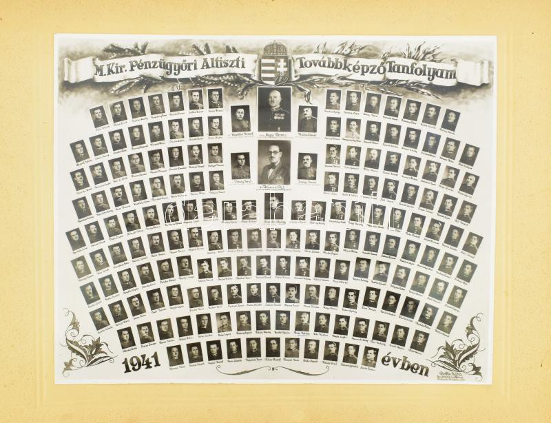 1941 M. kir. pénzügyőri altiszti továbbképző tanfolyam tablófotó, többek közt a több kitüntetéssel dekorált vitéz Nagy Ferenc főfelügyelő, a pénzügyőri altiszti iskola parancsnoka portréjával, Botfán Mária budapesti műterméből, kartonra kasírozott fotó, 30x40.