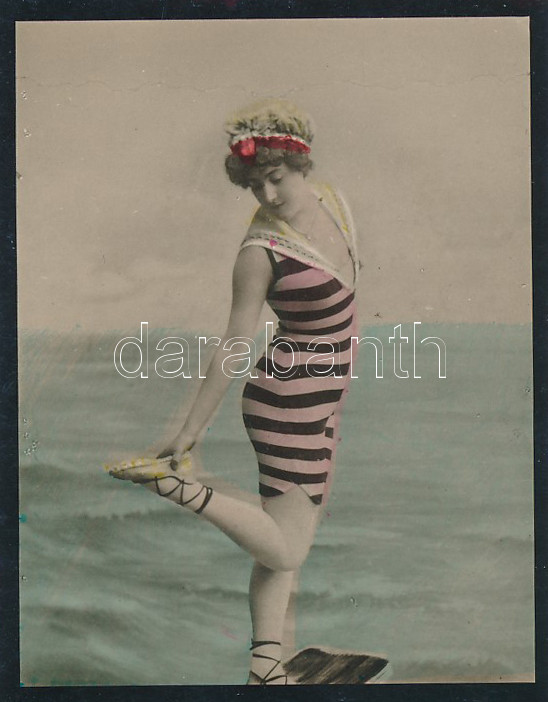 cca 1910 Fürdőruhás hölgy, színezett fotó, hátoldalán cigaretta reklám... https://www.darabanth.com/de/446-Fernauktion/446.0/Fotografie/Foto~500023/cca-1910-Furdoruhas-holgy-szinezett-foto-hatoldalan-cigaretta-reklammal-6C3975-cm~II2951061