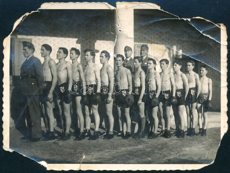 cca 1940 Cegléd, Fiatal fiúk boxkesztyűben, magyar címeres rövidnadrág... https://www.darabanth.com/de/446-Fernauktion/446.0/Fotografie/Foto~500023/cca-1940-Cegled-Fiatal-fiuk-boxkesztyuben-magyar-cimeres-rovidnadragban-hatoldalan-Pesti-~II2949533