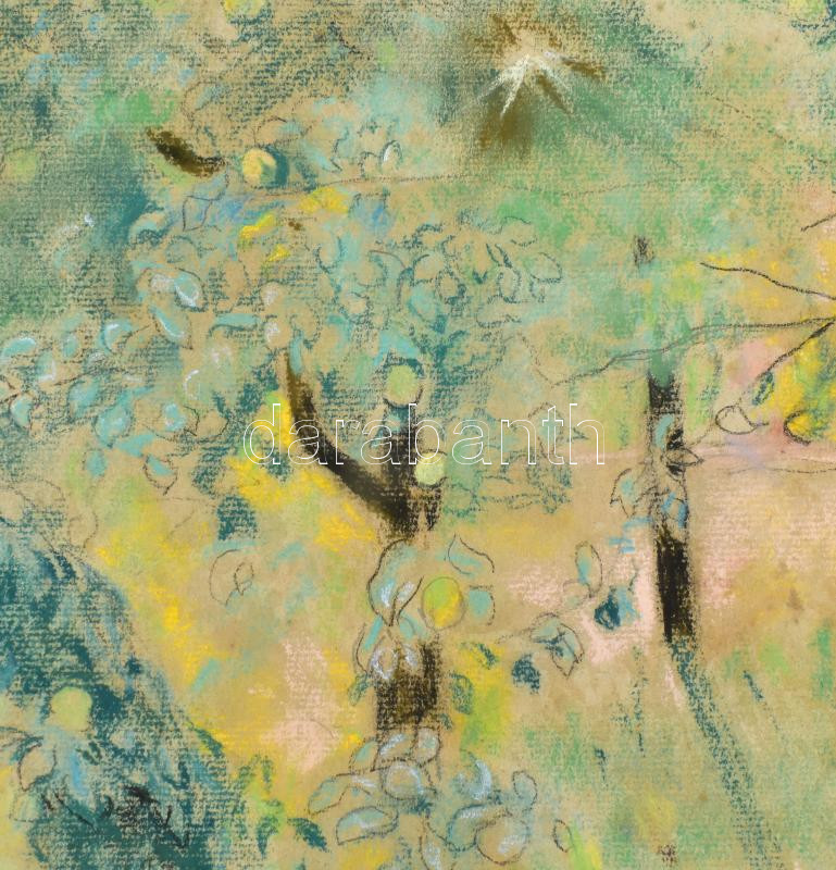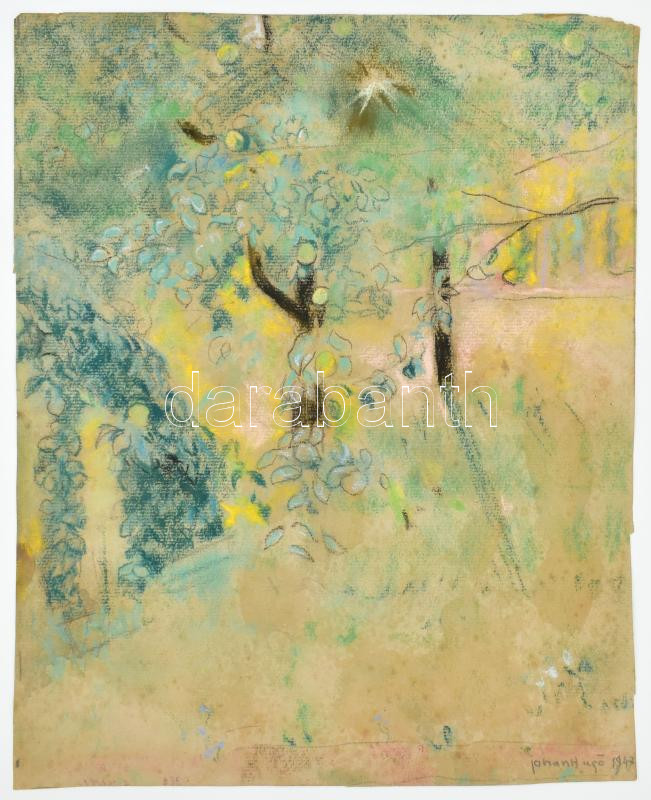 Johan Hugó (1891-1956), kétoldalas mű: Kertrészlet, 1947. Pasztell, papír, jelzett. Hátoldalán: Férfi akt. Szén, papír. Proveniencia: Johan Hugó hagyatéka. Jobb felső sarkában kissé sérült. 30x24 cm. / watercolour and charcoal on paper, signed, slightly damaged. Provenance: from the estate of the artist.