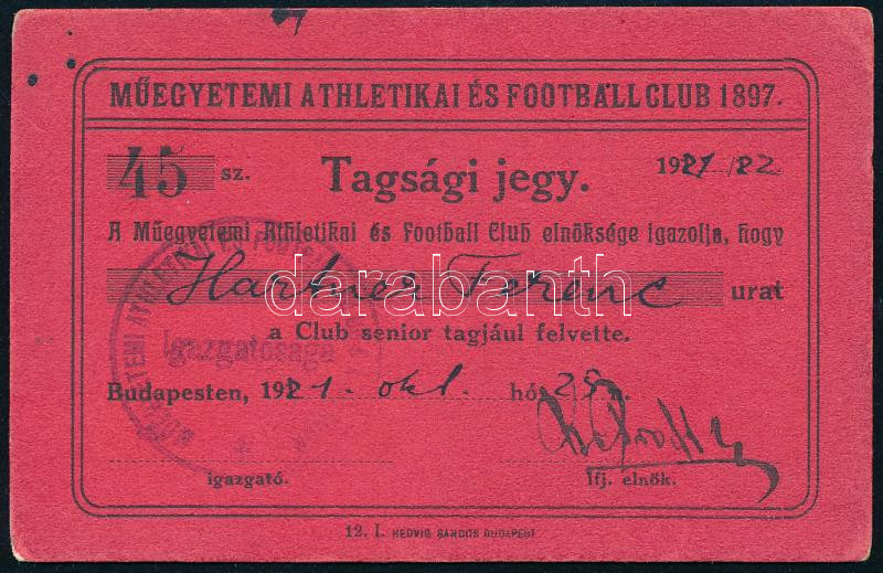 1921 Bp., Műegyetemi Athletikai és Football Club tagsági jegy https://www.darabanth.com/de/446-Fernauktion/446.0/Kunst-Dokumente-andere-Sammelgebiete/Dokument~500020/1921-Bp-Muegyetemi-Athletikai-es-Football-Club-tagsagi-jegy~II2952040