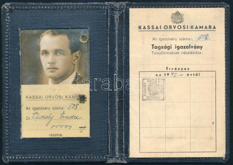 1942 A Kassai Orvosi Kamara fényképes igazolványa, magyar címerrel, 12... https://www.darabanth.com/de/446-Fernauktion/446.0/Kunst-Dokumente-andere-Sammelgebiete/Dokument~500020/1942-A-Kassai-Orvosi-Kamara-fenykepes-igazolvanya-magyar-cimerrel-12x8-5-cm~II2949523
