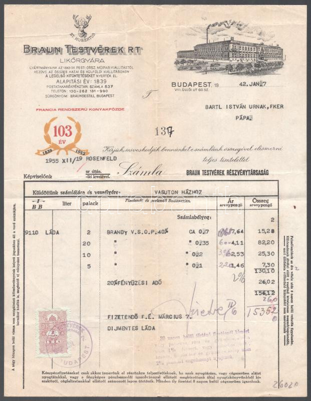 1942 Braun Testvérek R.T. Likőrgyára fejléces számla, vízjeles papír https://www.darabanth.com/de/446-Fernauktion/446.0/Kunst-Dokumente-andere-Sammelgebiete/Dokument~500020/1942-Braun-Testverek-RT-Likorgyara-fejleces-szamla-vizjeles-papir~II2953565