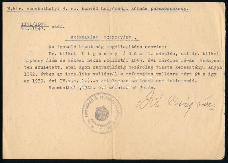 1942 Katonai kórházi származási igazolvány, nem zsidó származásról https://www.darabanth.com/de/446-Fernauktion/446.0/Kunst-Dokumente-andere-Sammelgebiete/Dokument~500020/1942-Katonai-korhazi-szarmazasi-igazolvany-nem-zsido-szarmazasrol~II2947805
