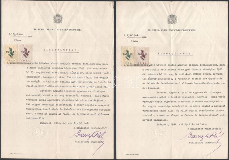 Beschreibung: 1944 Nemességet igazoló belügyminisztériumi okirat, 2 db