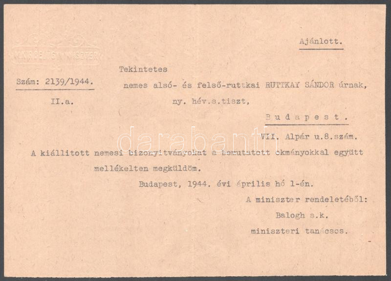 1944 Nemességet igazoló belügyminisztériumi okirat, 2 db https://www.darabanth.com/de/446-Fernauktion/446.0/Kunst-Dokumente-andere-Sammelgebiete/Dokument~500020/1944-Nemesseget-igazolo-belugyminiszteriumi-okirat-2-db~II2947823