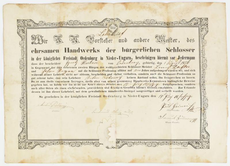 Beschreibung: cca 1870 Sopron, lakatos segédlevél, aláírásokkal, papírfelzetes viaszpecséttel, 15kr okmánybélyeggel. Hajtott, kisebb gyűrődésekkel, foltokkal, 49x35 cm
