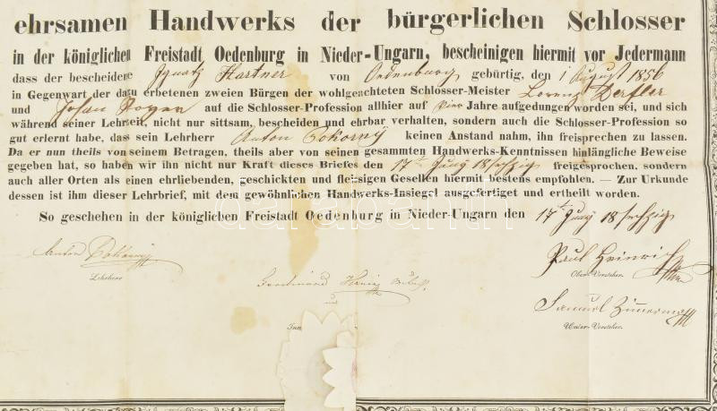 cca 1870 Sopron, lakatos segédlevél, aláírásokkal, papírfelzetes viasz... https://www.darabanth.com/de/446-Fernauktion/446.0/Kunst-Dokumente-andere-Sammelgebiete/Dokument~500020/cca-1870-Sopron-lakatos-segedlevel-alairasokkal-papirfelzetes-viaszpecsettel-15kr-okmany~II2952170