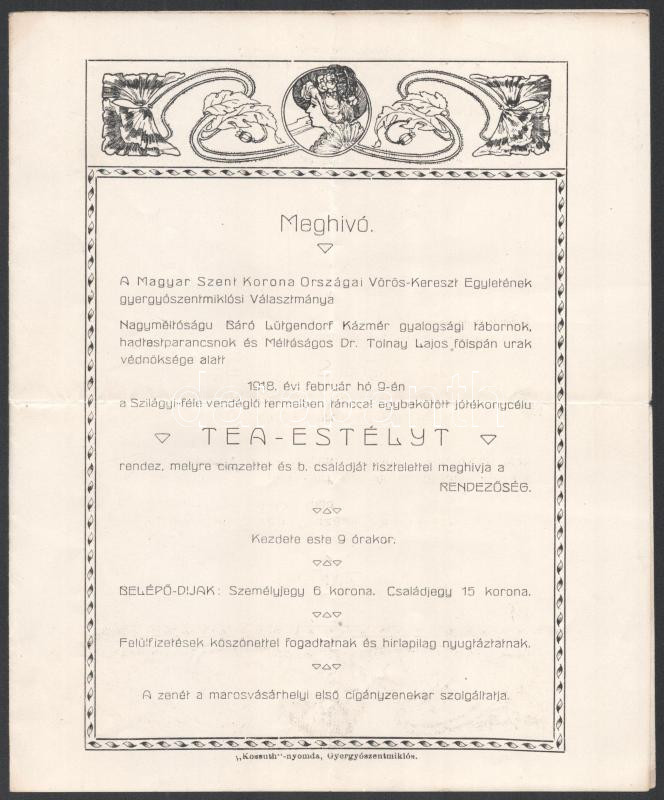 1918 Meghívó a Magyar Szent Korona Országai Vörös-Kereszt Egyletének gyergyószentmiklósi választmánya által rendezett teaestélyre. Gyergyószentmiklós, "Kossuth"-ny. Szecessziós illusztrációval. Hajtva, jó állapotban, 20,5x16,5 cm