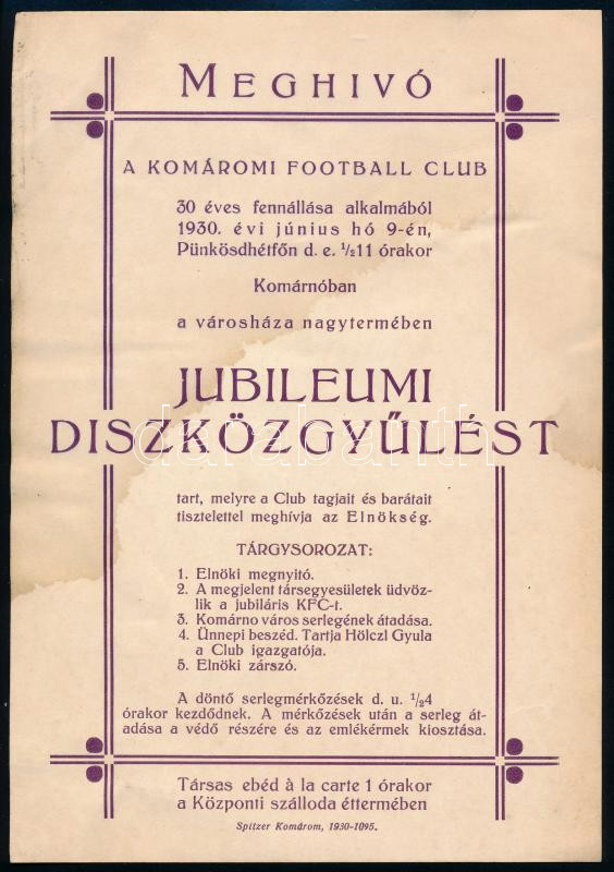 1930 Meghívó a Komáromi Football Club jubileumi díszközgyűlésére, folt... https://www.darabanth.com/de/446-Fernauktion/446.0/Kunst-Dokumente-andere-Sammelgebiete/Drucksachen~1000006/1930-Meghivo-a-Komaromi-Football-Club-jubileumi-diszkozgyulesere-foltos~II2952272