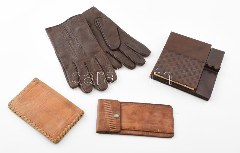 Beschreibung: 4 darab bőr tárgy: kesztyű, tárca, tolltartó, jegyzettömb