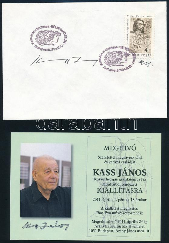 Beschreibung: 1994 Kass János (1927-2010) aláírása egy borítékon, általa tervezett bélyeggel, Bélyegmúzeum pecsétjeivel + 2011 kiállítási meghívója