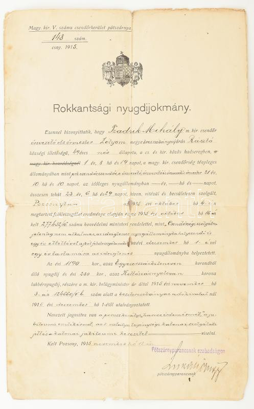 1915 Pozsony, rokkantsági nyugdíjokmány kir. csendőrőrmester részére, ... https://www.darabanth.com/de/446-Fernauktion/446.0/Kunst-Dokumente-andere-Sammelgebiete/Militaria~1000001/1915-Pozsony-rokkantsagi-nyugdijokmany-kir-csendorormester-reszere-parancsnoki-alairass~II2948312