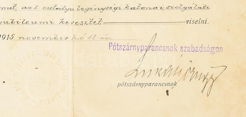 Beschreibung: 1915 Pozsony, rokkantsági nyugdíjokmány kir. csendőrőrmester részére, parancsnoki aláírással