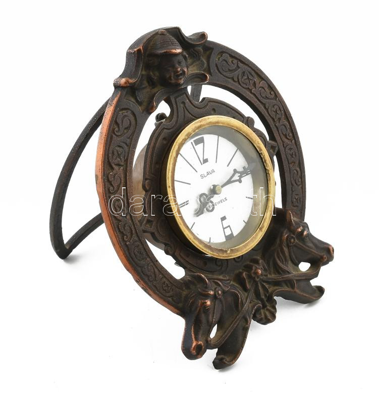 Beschreibung: Slava támasztható lovas mintás asztali óra, bronz, működik, m: 12 cm