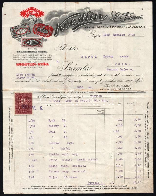 Beschreibung: 1930 Koestlin L. és Társai Keksz-, Biszkvit- és Csokoládégyár, Győr dekoratív fejléces számla