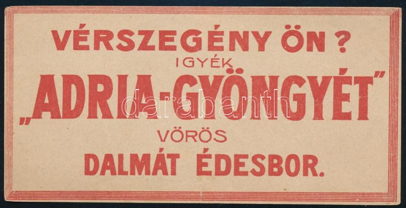 cca 1910-1920 ,,Adria-gyöngye" vörös dalmát édesbor számolócédula, kis... https://www.darabanth.com/de/446-Fernauktion/446.0/Kunst-Dokumente-andere-Sammelgebiete/Werbungen~500024/cca-1910-1920-Adria-gyongye-voros-dalmat-edesbor-szamolocedula-kis-szakadassal~II2955645
