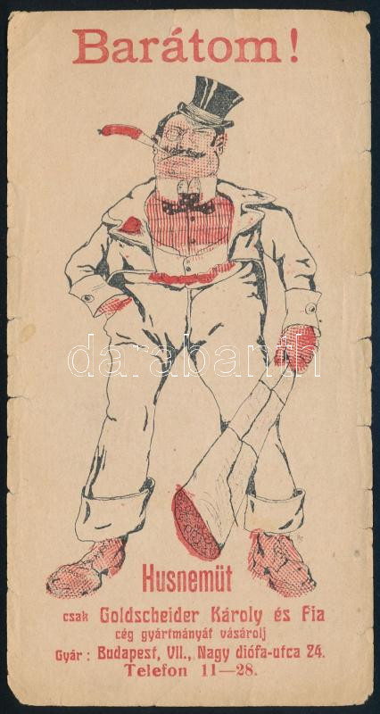 cca 1910-1920 "Barátom! Husnemüt csak Goldscheider Károly és Fia cég g... https://www.darabanth.com/de/446-Fernauktion/446.0/Kunst-Dokumente-andere-Sammelgebiete/Werbungen~500024/cca-1910-1920-Baratom-Husnemut-csak-Goldscheider-Karoly-es-Fia-ceg-gyartmanyat-vasarolj~II2955641