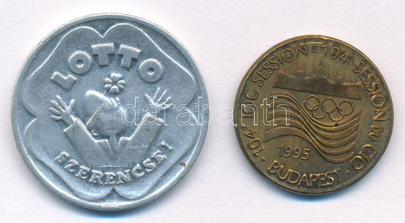 1962. "5 Éves A Lottó!" Al emlékérem (28mm) + 1995. "104. Nemzetközi Olimpiai Bizottsági Ülés Budapest" angol és francia nyelvű bronz emlékérem (22mm) T:XF patina, az egyiken kis ü.