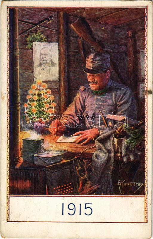 1915 Weihnachten 1915 / Első világháborús osztrák-magyar katonai karácsonyi üdvözlet / WWI Austro-Hungarian K.u.K. military art postcard with Christmas greeting, Franz Joseph I of Austria portrait s: F. Kuderna + "K.U.K. ETAPPENSTATIONSKOMMANDO"