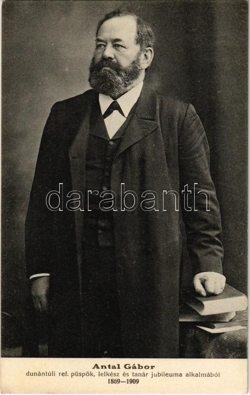 Antal Gábor (1843-1914), dunántúli református püspök, lelkész és tanár jubileuma alkalmából. A Dunántúli református egyházkerület püspöke 1896-tól haláláig, 1909 a genfi egyetemen a teológia díszdoktora, Magyar Protestáns Irodalmi Társaság elnöke 1907-1914 között