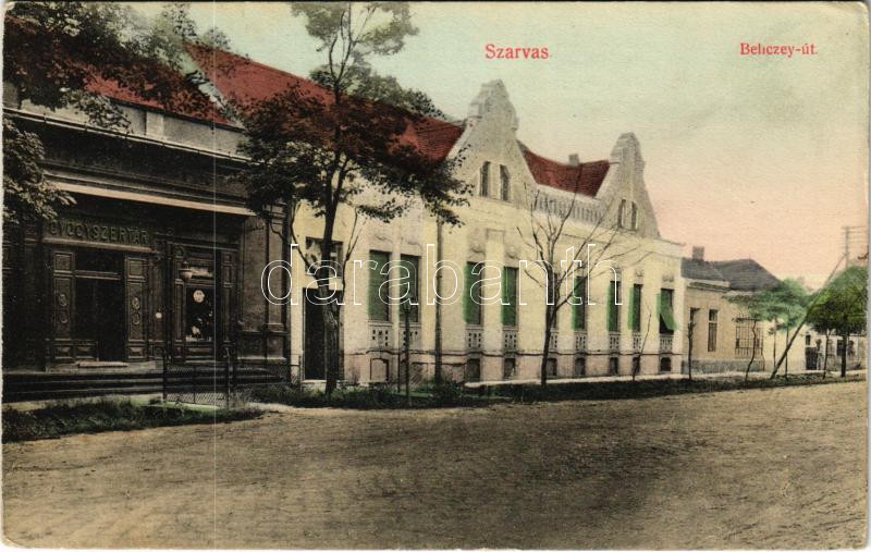 1916 Szarvas, Beliczey út, gyógyszertár. Müller Károlyné kiadása (EK) https://www.darabanth.com/de/447-Fernauktion/447.0/Ansichtskarten/Ungarn~2000005/1916-Szarvas-Beliczey-ut-gyogyszertar-Muller-Karolyne-kiadasa-EK~II2963561