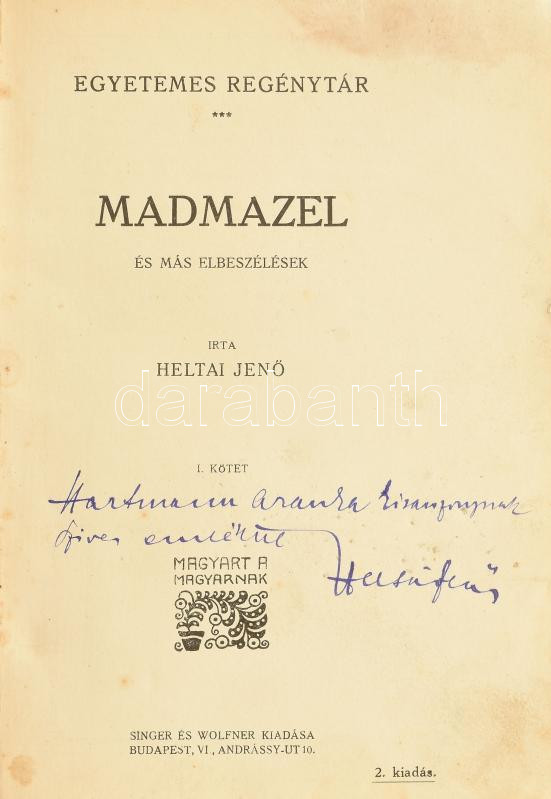 Heltai Jenő: Madmazel és más elbeszélések. I. köt. Egyetemes Regénytár. Bp., [1910], Singer és Wolfner, 141+(3) p. Második kiadás. Kiadói egészvászon-kötés, viseltes, sérült, foltos borítóval, helyenként kissé foltos lapokkal. A szerző, Heltai Jenő (szül. Herzl Eugen) (1871-1957) Kossuth-díjas író, költő, producer, dramaturg által DEDIKÁLT példány.