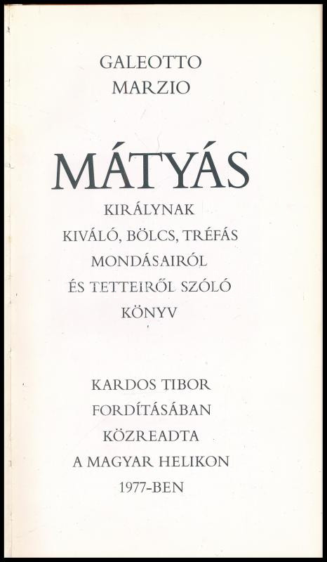 Galeotto Marzio: Mátyás királynak kiváló, bölcs, tréfás mondásairól és... https://www.darabanth.com/de/447-Fernauktion/447.0/Bucher/Bucher-Geschichte~2000121/Galeotto-Marzio-Matyas-kiralynak-kivalo-bolcs-trefas-mondasairol-es-tetteirol-szolo~II2962555