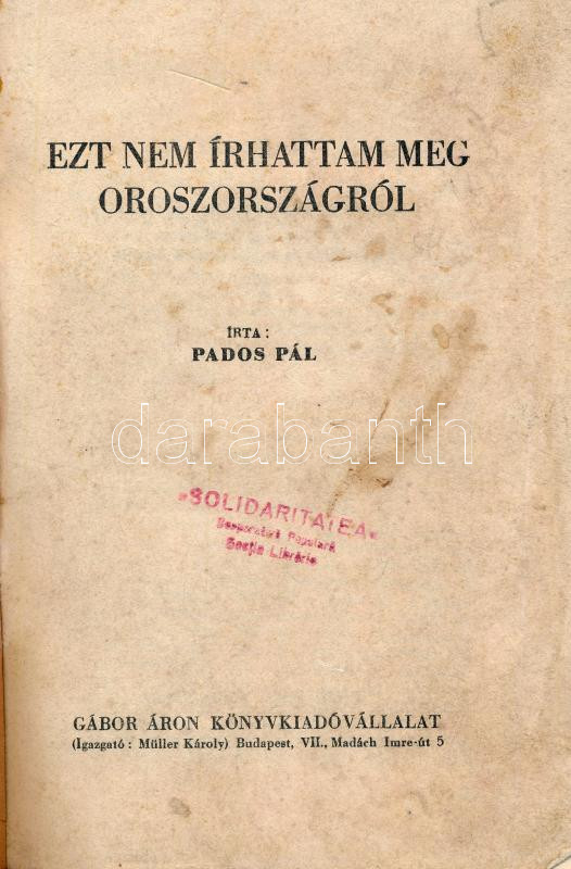 Pados Pál: Ezt nem írhattam meg Oroszországról. Bp., 1945, Gábor Áron Könyvkiadóvállalat, 124+(2) p. Papírkötésben, helyenként kissé foltos lapokkal, kissé sérült lapszélekkel, a könyvtesttől elváló borítóval.