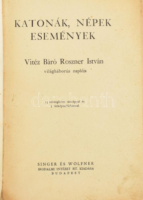Roszner István: Katonák, népek, események. Vitéz Báró Roszner István világháborús naplója. Bp., [1938], Singer és Wolfner (Hornyánszky-ny.), 595 p. + 2 (kihajtható térképek) t. Kiadói papírkötés, sérült, rossz állapotban, foltos, hiányos borítóval, a térképek jó állapotban.
