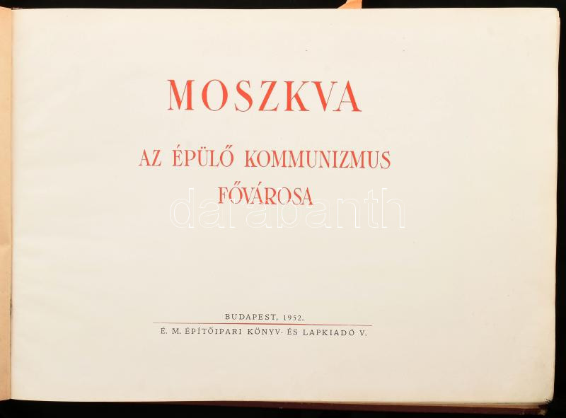 Moszkva, az épülÅ‘ kommunizmus fÅ‘városa. Szerk.: Lux László, SzendrÅ‘i JenÅ‘, Rojkó Ervin. Bp., 1952, É. M. ÉpÃtÅ‘ipari Könyv- és Lapkiadó V. Gazdag egészoldalas képanyaggal (közte szÃnes képek és kihajtható panorámaképek is). Kiadói egészvászon-kötés, a borÃtón minimális kopással, ajándékozási bejegyzéssel. Megjelent 1000 példányban.
