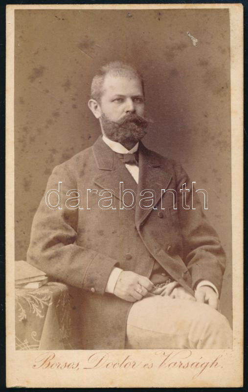 1876 Szakállas úriember portréja, keményhátú fotó Borsos, Doctor és Varságh m. kir. udvari fényképészek budapesti műterméből, vizitkártya, kissé foltos, 10,5x6,5 cm