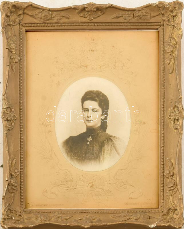 cca 1890-1900 Wittelsbach Erzsébet 'Sisi' (1830-1898) császárné és királyné portréfotója, Carl Pietzner bécsi udvari fotós műterméből, R. Lechner Bécs kiadása, dekoratív dombornyomott címeres és koronás paszpartuval, Viribus Unitis felirattal. Korabeli üvegezett, kissé sérült fakeretben, 11,5x9 (paszpartu: 22x16) cm