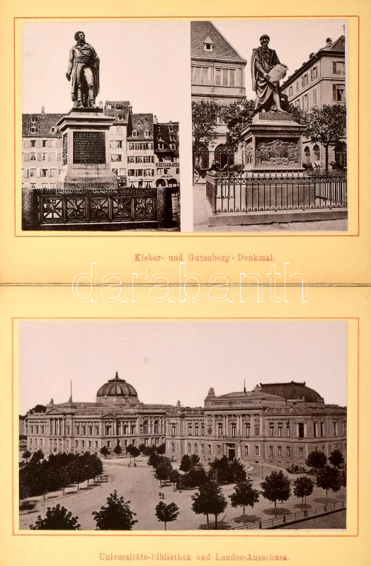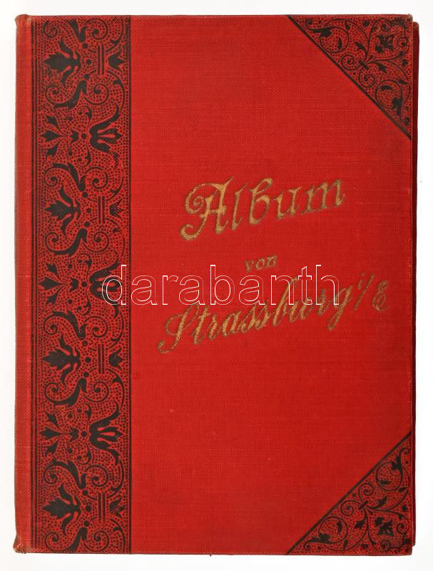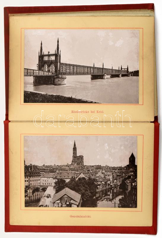 cca 1900-1910 Album von Strassburg, 10 fekete-fehér fotót tartalmazó leporelló, német nyelvű feliratokkal, ranyozott, festett egészvászon-kötés, kissé kopott borítóval.