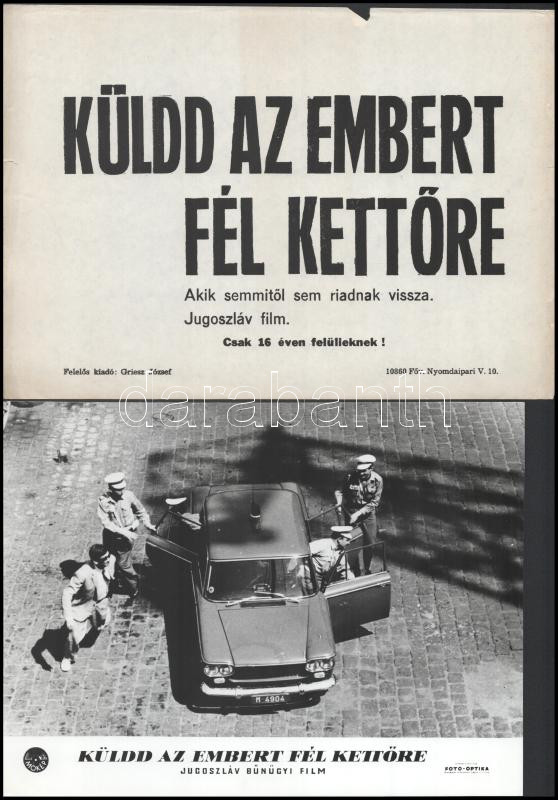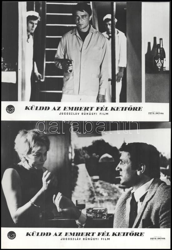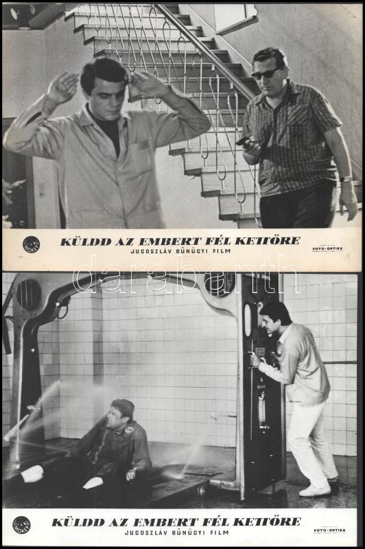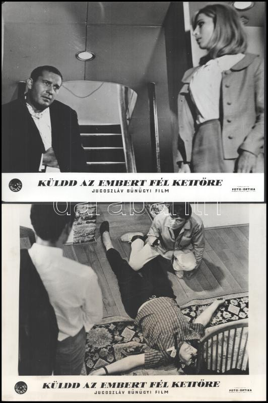 cca 1968 ,,Küldd az embert fél kettőre" című jugoszláv bűnügyi film jelenetei és szereplői, 13 db vintage produkciós filmfotó ezüst zselatinos fotópapíron, a használatból eredő (esetleges) kisebb hibákkal, + hozzáadva egy szöveges kisplakát, 18x24 cm