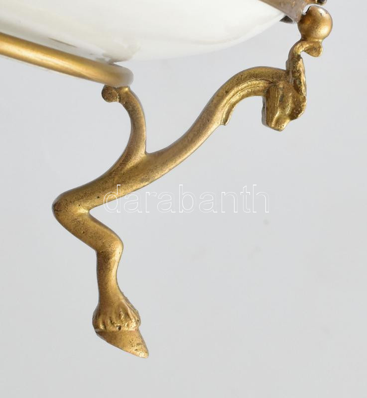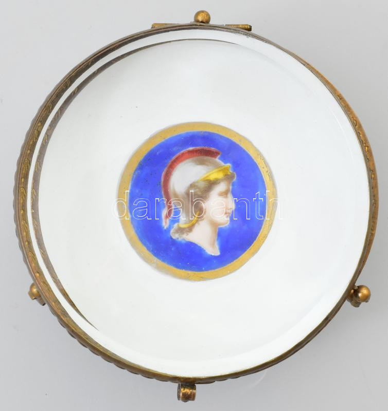 Antik háromlábú bonbonier, porcelán, üveg fedéllel, réz szerelékkel, porcelán belsejében kézzel festett, jelzés nélkül, restaurált, apró kopásnyomokkal, m: 8,5 cm, d: 12,5 cm